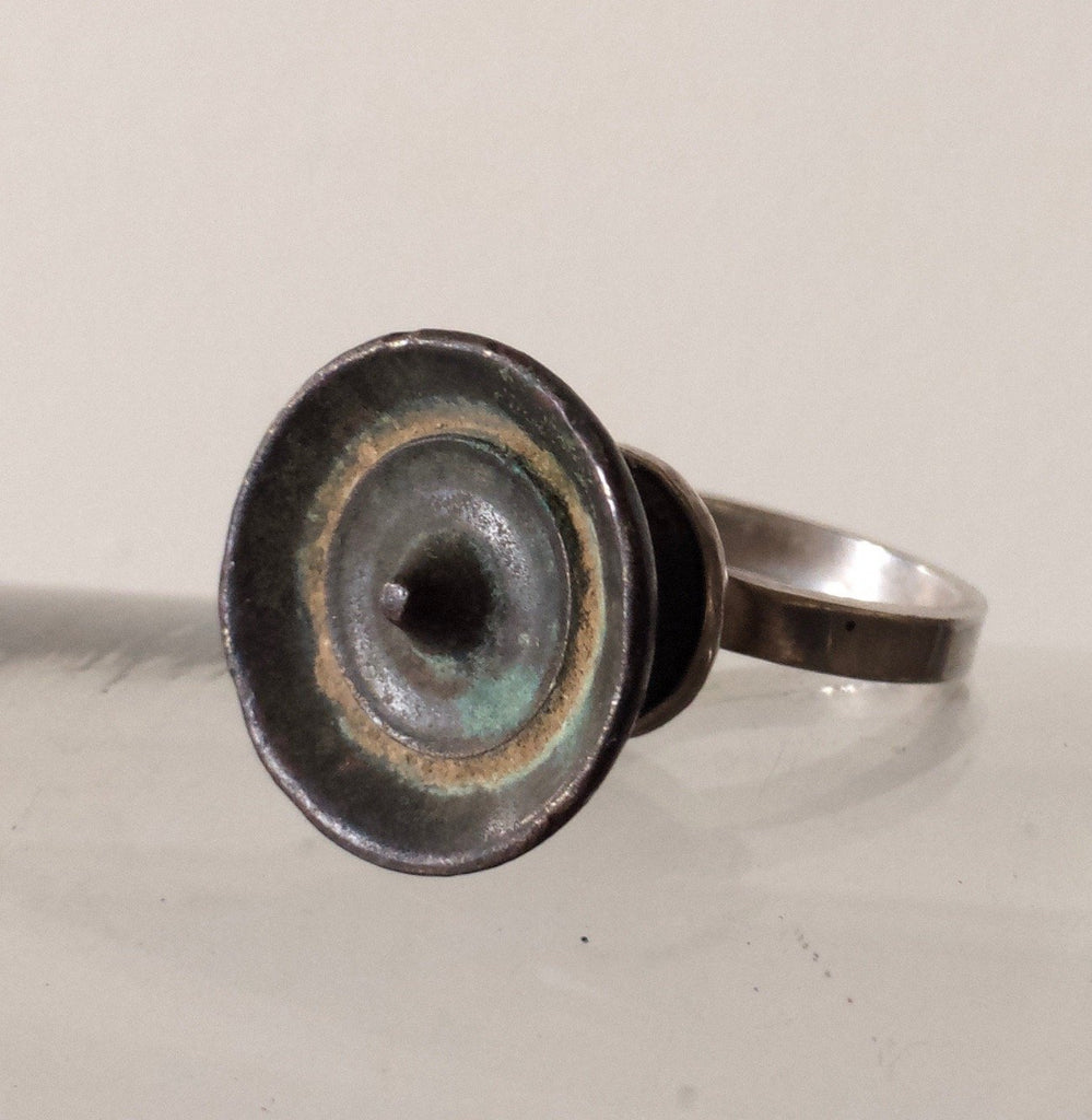 This bronze mini drawer pull or knob is a found object, sourced at an antique market in Somerset. It is hard to date exactly but the fine detail would suggest 18th century. Originally it had a tiny screw thread at the base, this has been removed and the piece set onto a silver bezel and mounted onto a silver band by Badger's Velvet master jeweller.
