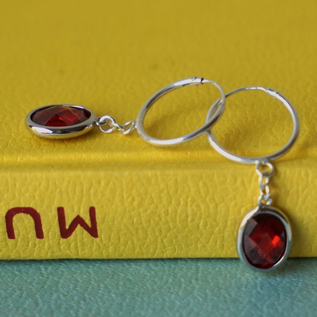 A beautiful pair of silver hoop earrings hung with oval garnet zirconia drops set in a silver bezel.