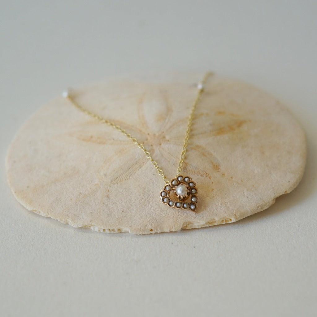 This fine Victorian 18ct gold and seed pearl heart began life as a tie pin. At the centre sits a larger pearl in a claw setting. We have re-purposed this piece into a pendant which now hangs from a handmade gold & pearl chain.