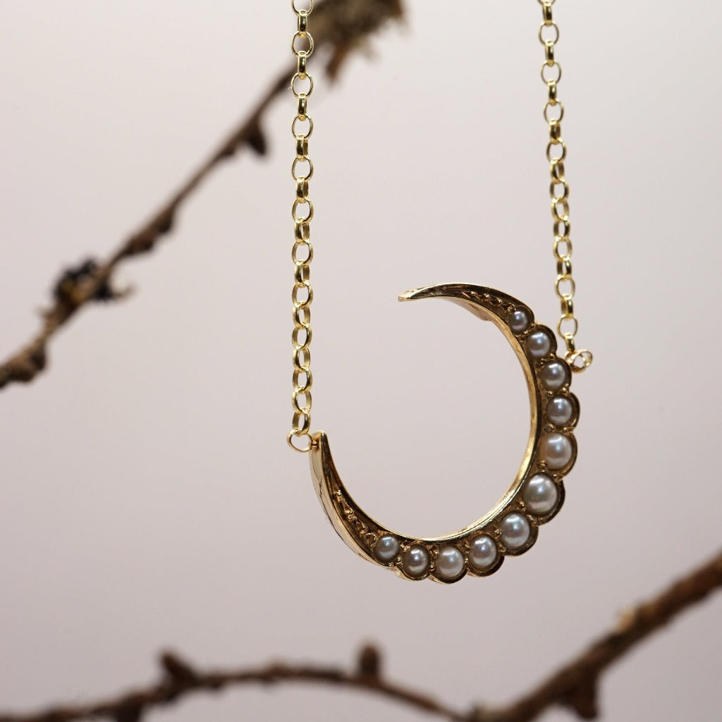 An antique 9ct gold crescent moon set with perfect seed pearls, originally a brooch, has been transformed into this beautiful necklace with the addition of a 9ct gold fine belcher chain.