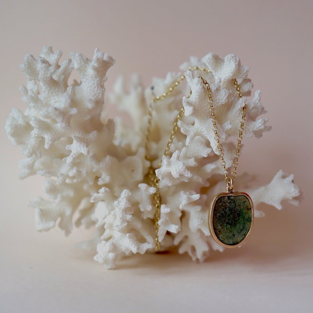 An original 2000 year old Roman coin set in a 9ct gold coin mount hanging from an 18" 9ct gold Belcher chain.