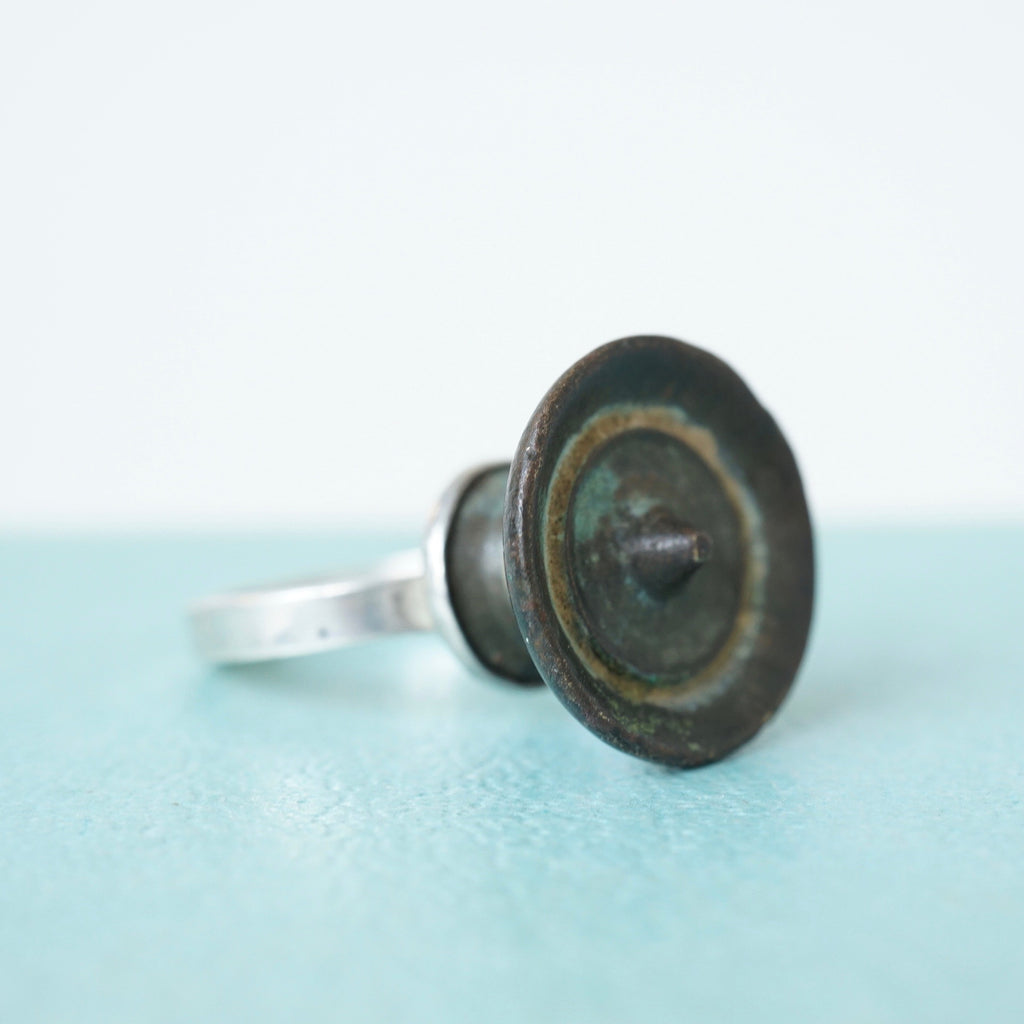 This bronze mini drawer pull or knob is a found object, sourced in an antique market in Somerset. It is hard to date exactly but the fine detail would suggest Georgian. Originally it had a tiny screw thread at the base, this has been removed and the piece set onto a silver bezel and mounted onto a silver band by Badger's Velvet master jeweller.