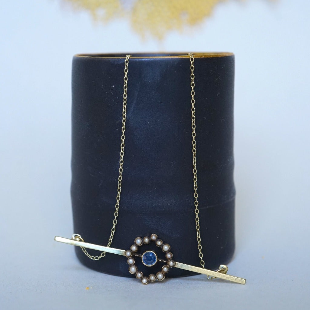 An antique pearl and sapphire 15ct gold bar necklace began life as a brooch.