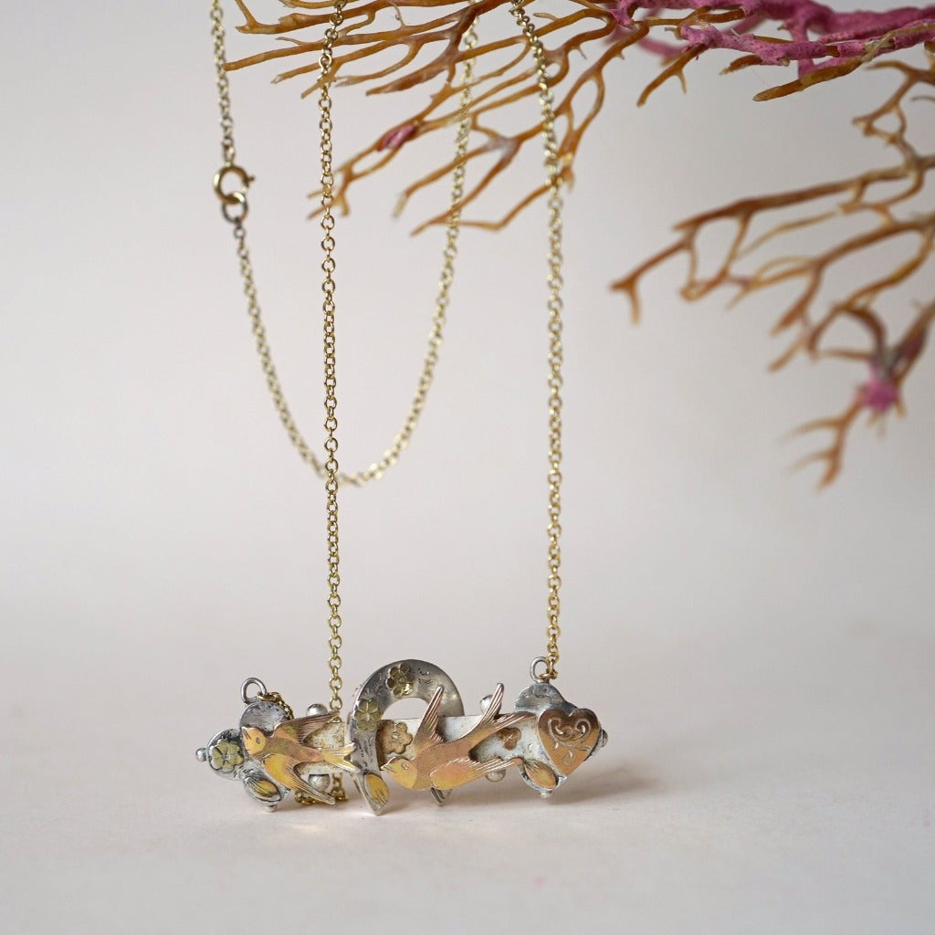 Antique Silver and Gold Swallow and Horseshoe Necklace