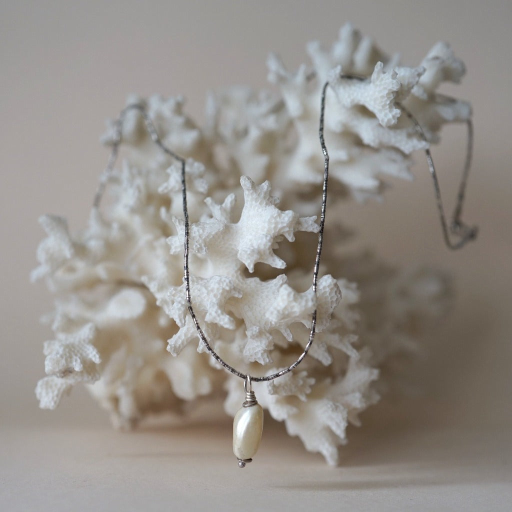 A beautiful natural freshwater baroque pearl hangs from an antique 17" Indian silver chain which is made out of etched silver bugle beads threaded onto a cord and with a traditional hook clasp.