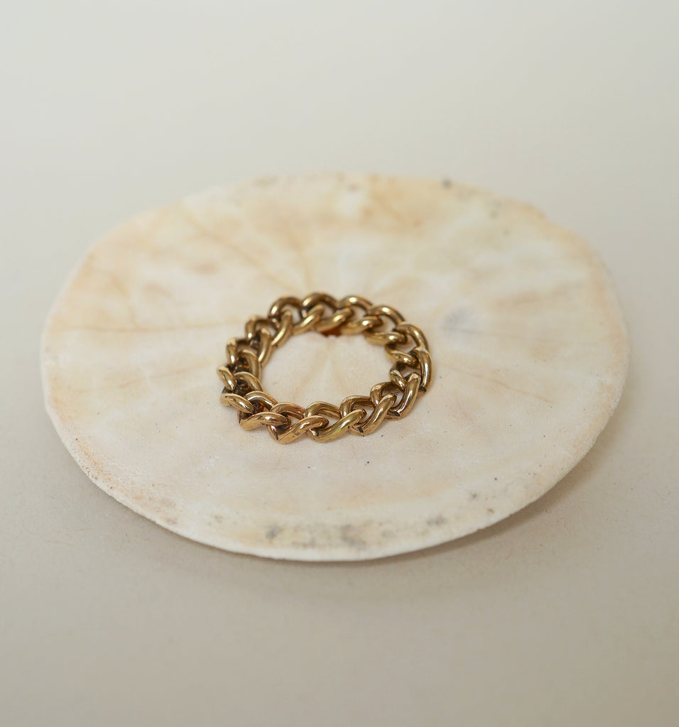 We have made this unique and stylish large ring from a length of chunky gold curb chain left over from a re-purposed watch chain that became a necklace and is now sold .