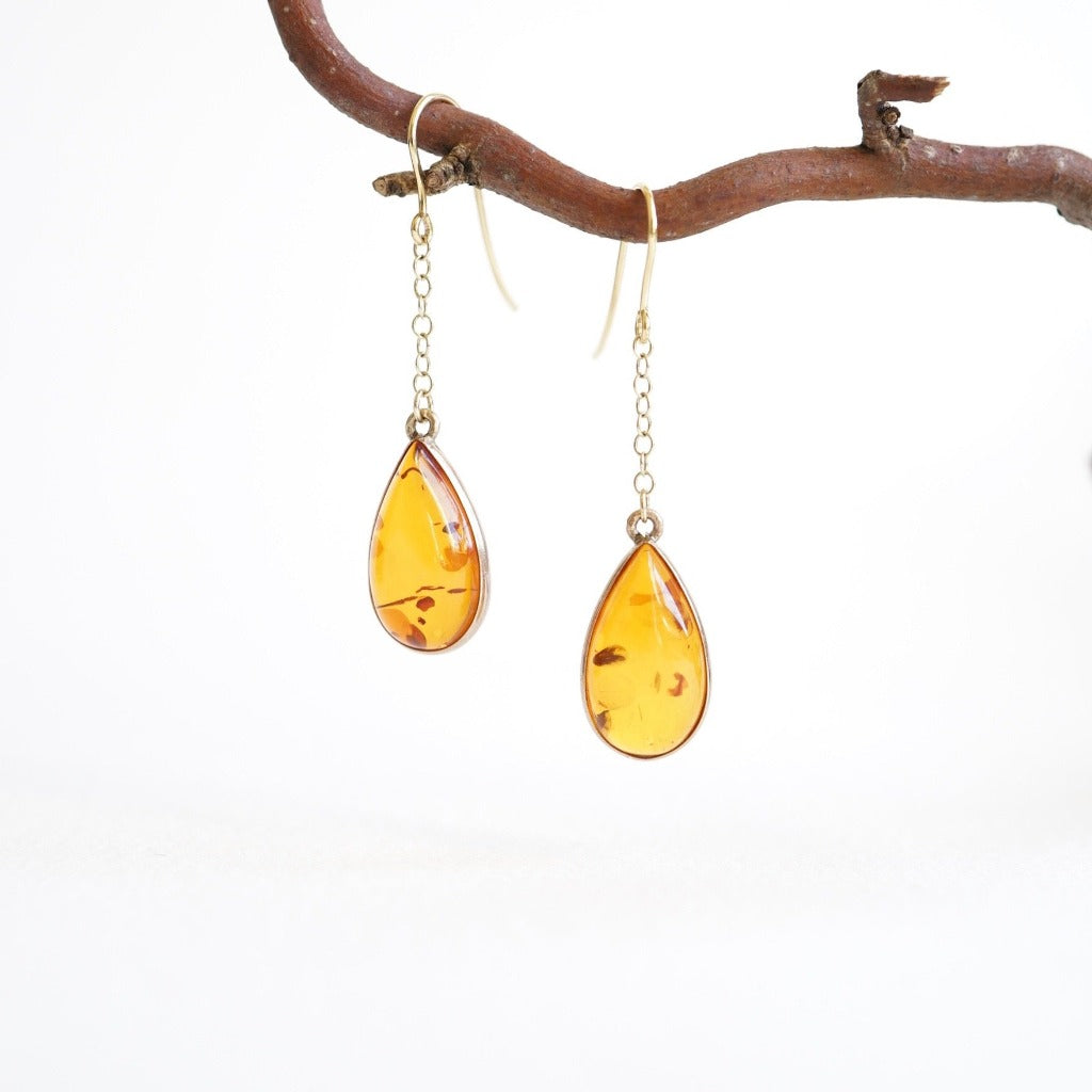 A beautiful pair of vintage natural amber teardrops surrounded by a 9ct gold bezel. The drops hang from 14ct gold-filled chain and a Roman style Hook.
