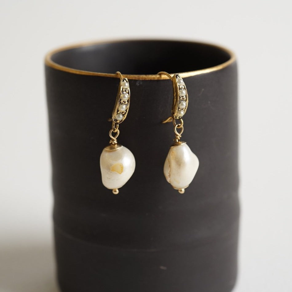 A beautiful pair of natural freshwater baroque pearls hang from 14ct gold-filled vintage hooks set with seed pearls