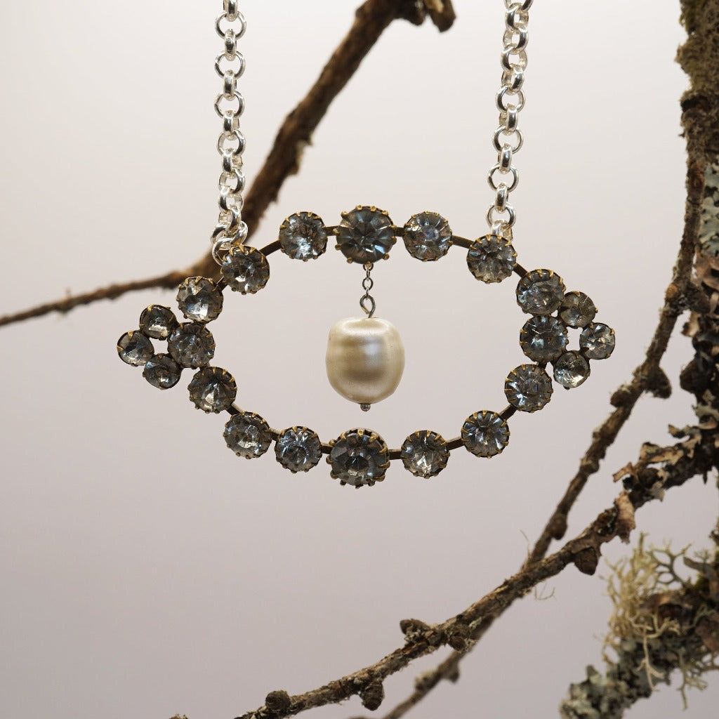 This beautiful vintage diamanté oval began life as a glamorous 1920s belt buckle and has been re-purposed into a unique wonderful 3rd eye necklace with the addition of a vintage oyster white freshwater pearl at its centre.