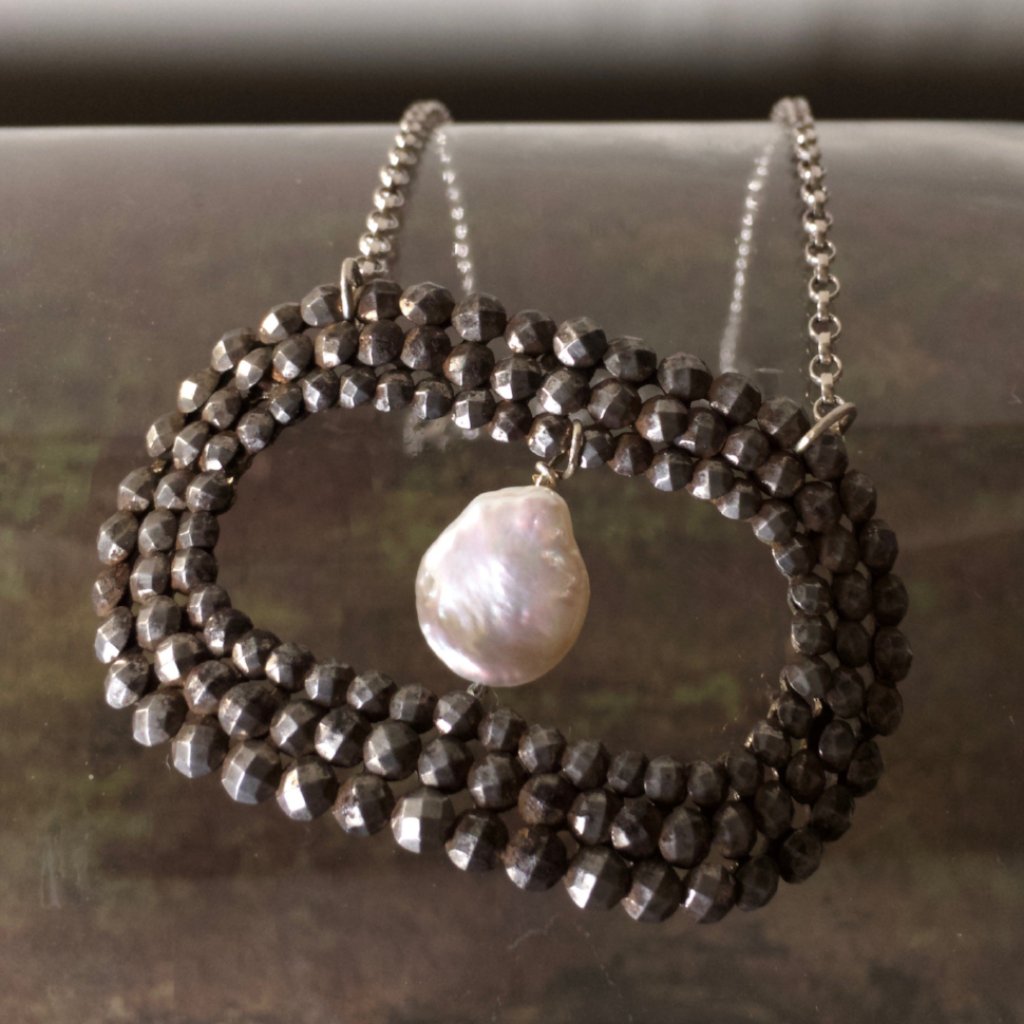 The buckle measures approx 6cm x 4cm and has a beautiful freshwater flat pearl eye hanging at it's centre. This hangs from a lightly oxidised silver belcher chain.