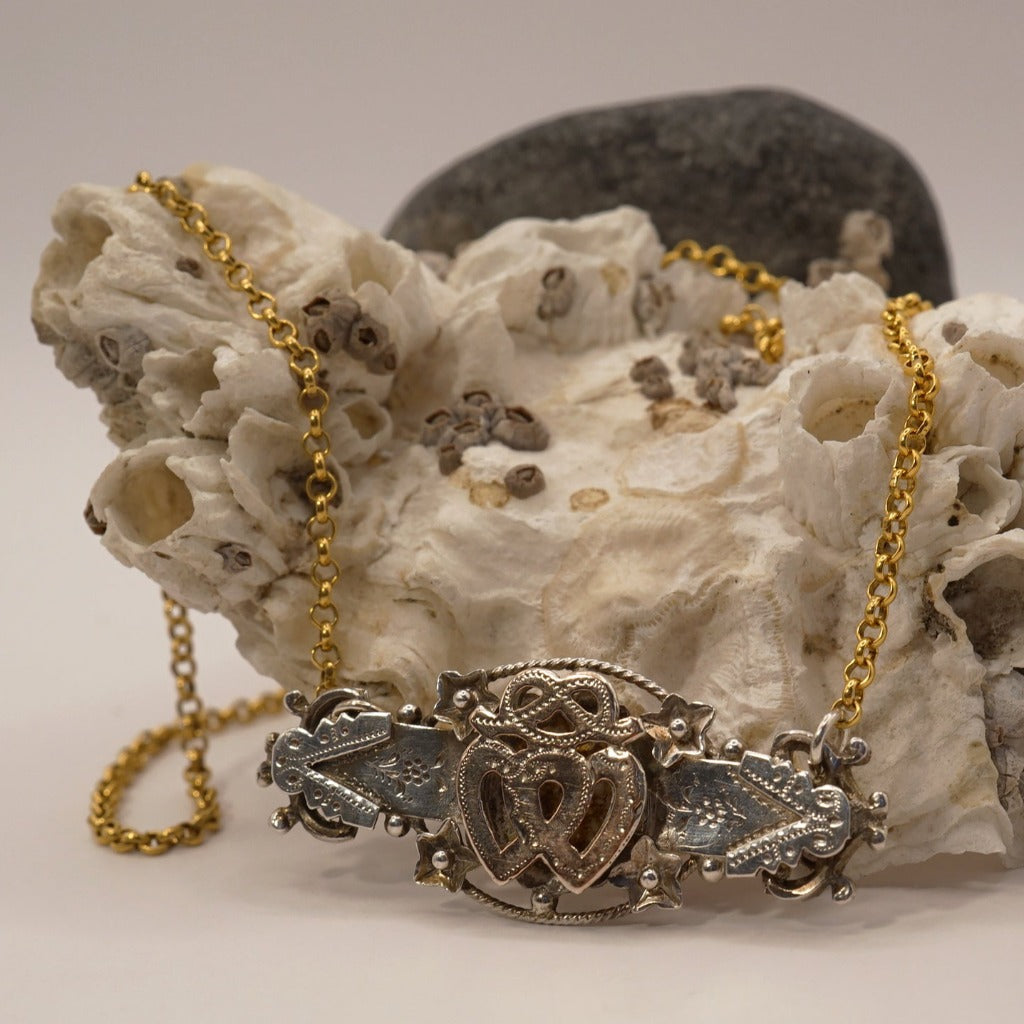 It shows beautiful hand made craftsmanship, two gold hearts adorned with a love knot sit on a substantial silver bar with an arrow style feature at each end and ball and flower details.