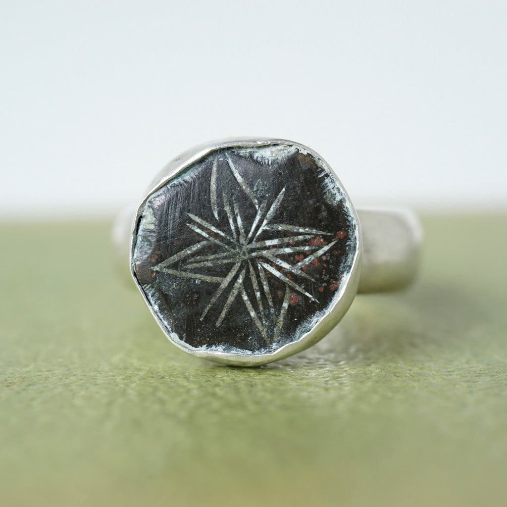 We purchased a collection of bronze buttons from a dealer in antiquities and are slowly creating one off pieces of jewellery from each. Set into a silver bezel and mounted onto a silver band the bronze will eventually start to show through as the dark patina wears off as the ring is worn and exposed to everyday use.