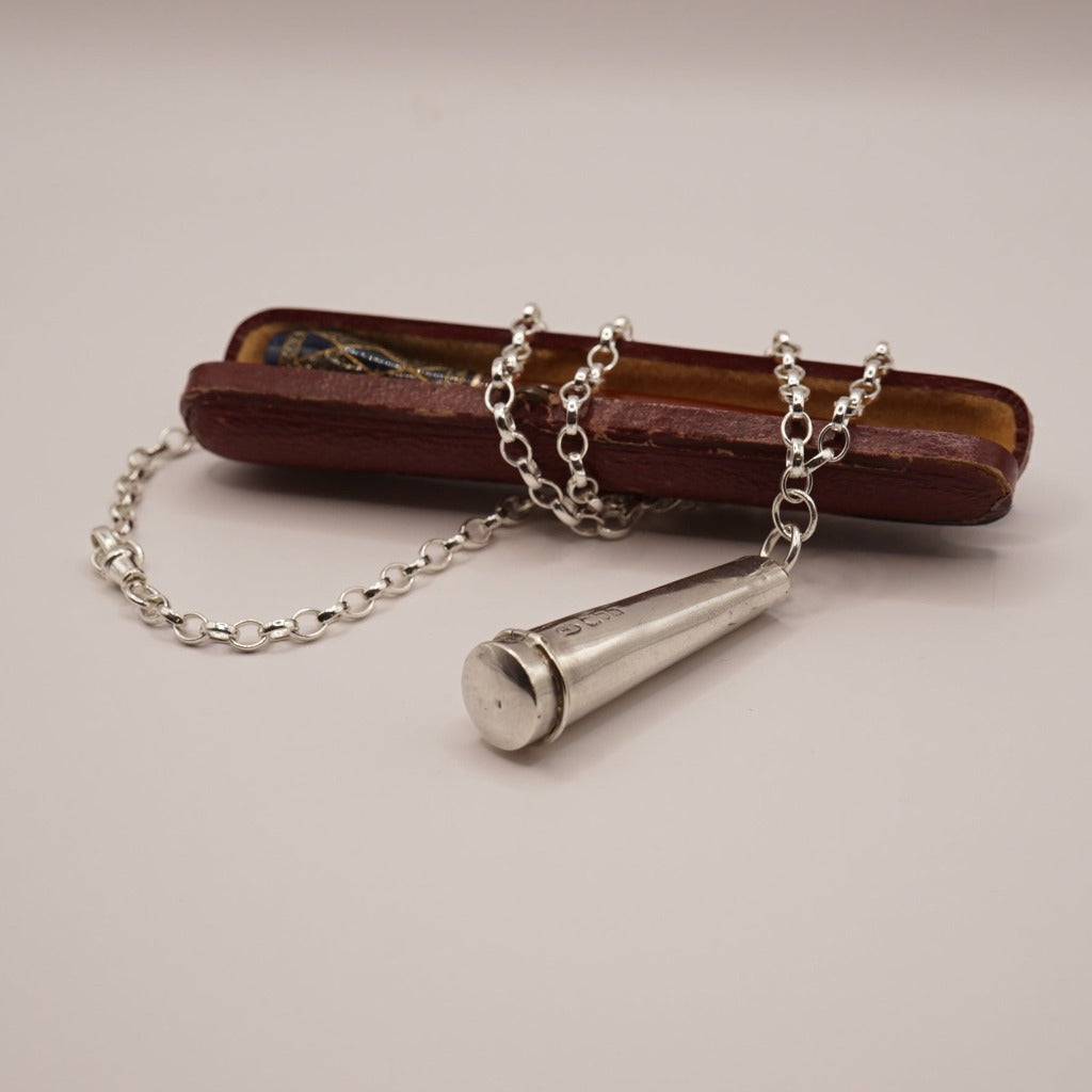 This beautiful silver necklace has been made from a piece of vintage belcher chain with an Albert clasp, acquired from an old watch chain and to which we have added a stunning and unique lidded cigarette holder case.