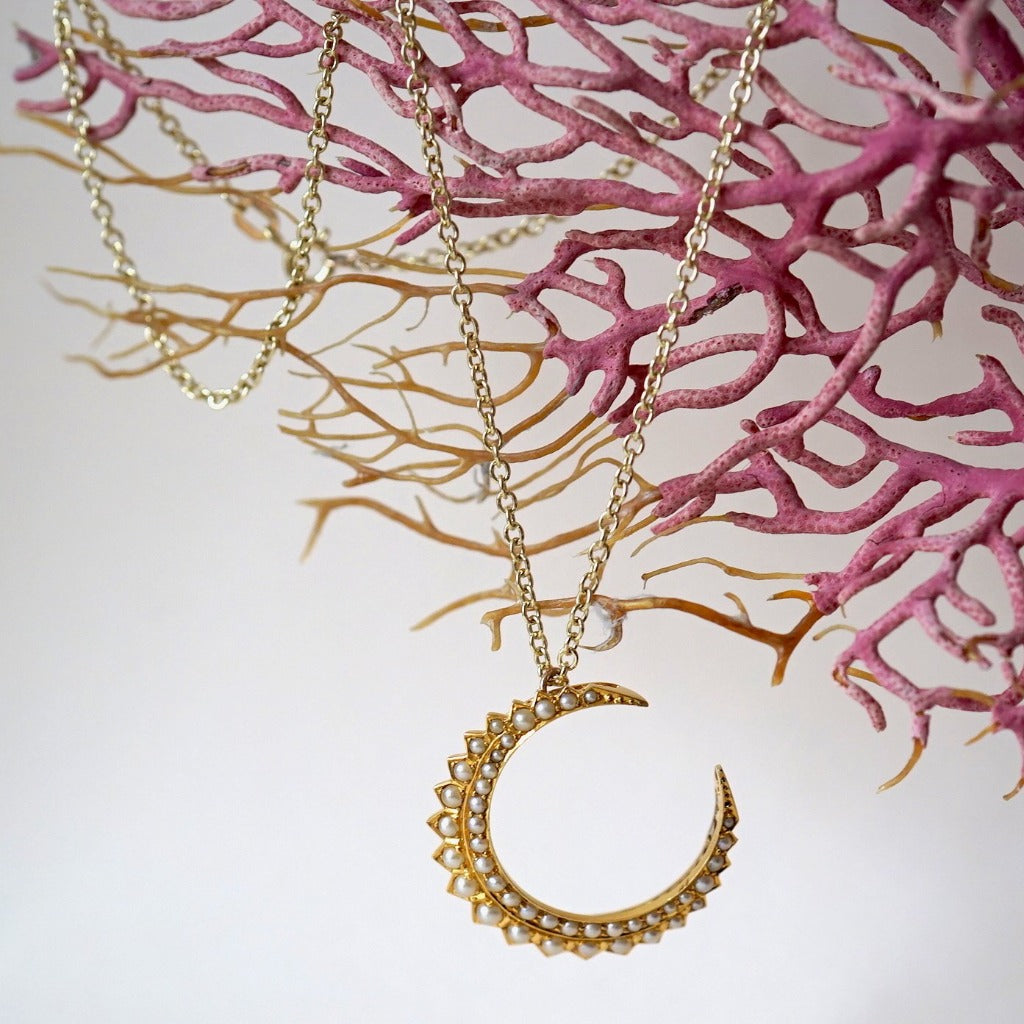 An antique 9ct gold crescent moon brooch set with perfect seed pearls has been transformed into this beautiful necklace and now hangs from an 18" (46cm) 9ct gold chain.