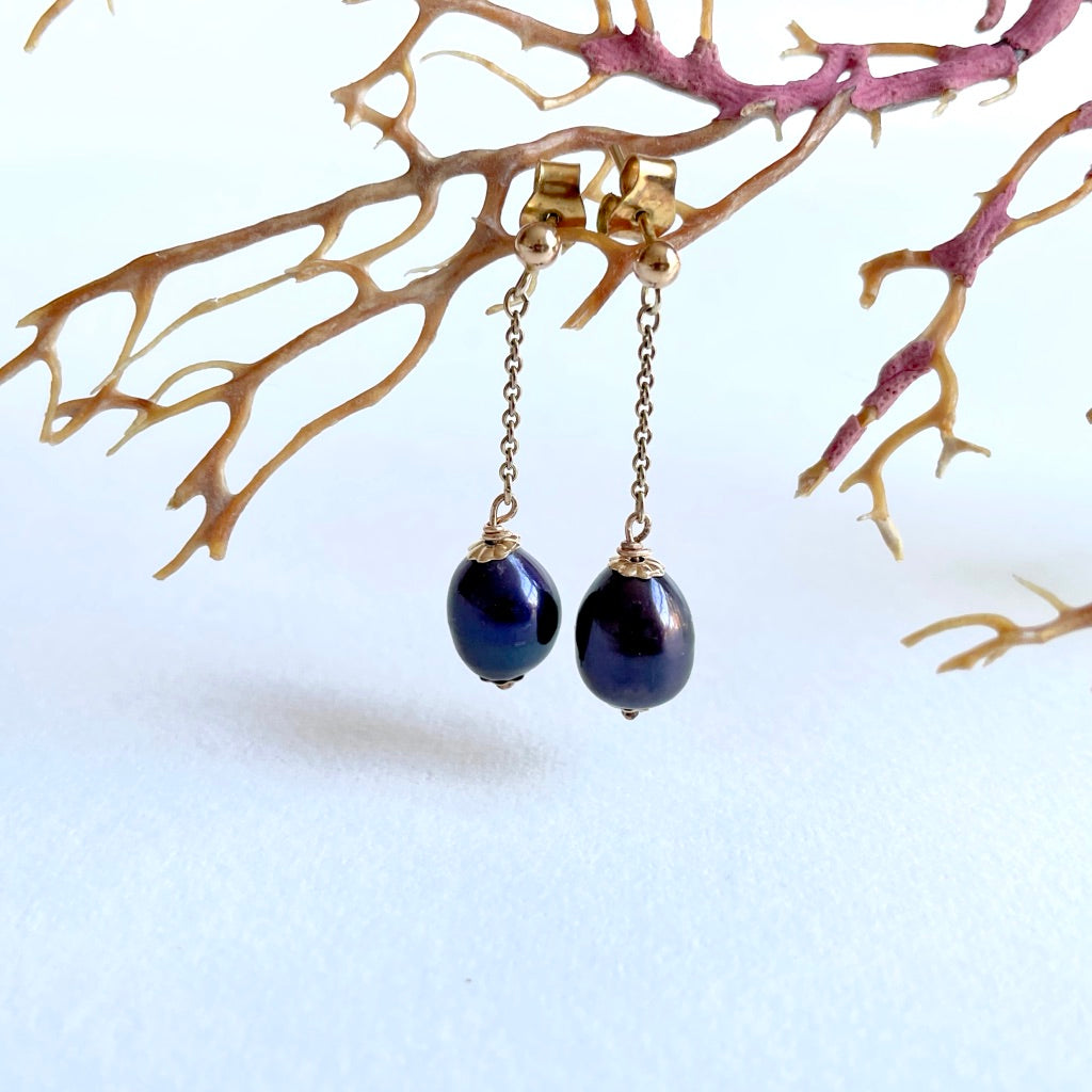 Freshwater Black pearl and Gold Chain Stud Earrings.