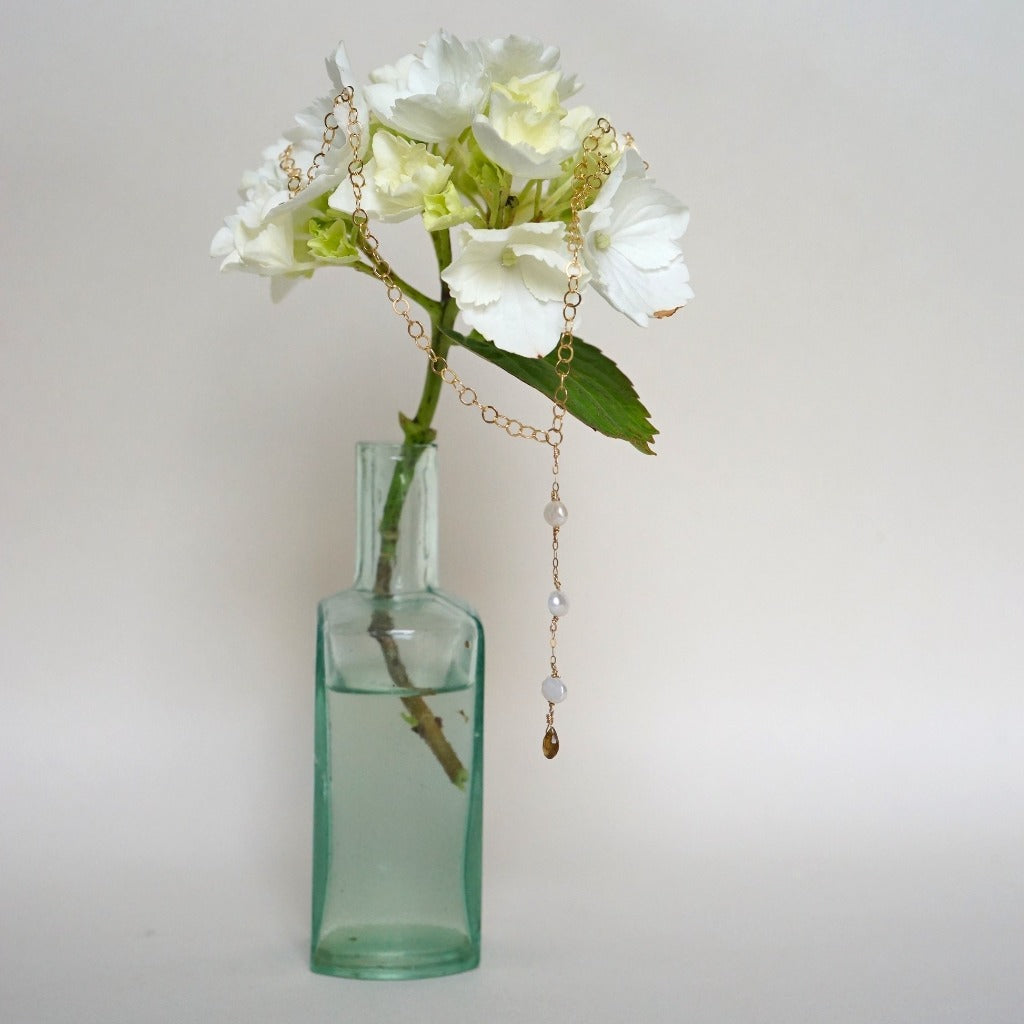 A stunning unique necklace made from 3 antique freshwater pearls, rescued from an old necklace that have been linked together with fine 9ct gold chain. A grey green tourmaline hangs from the end.