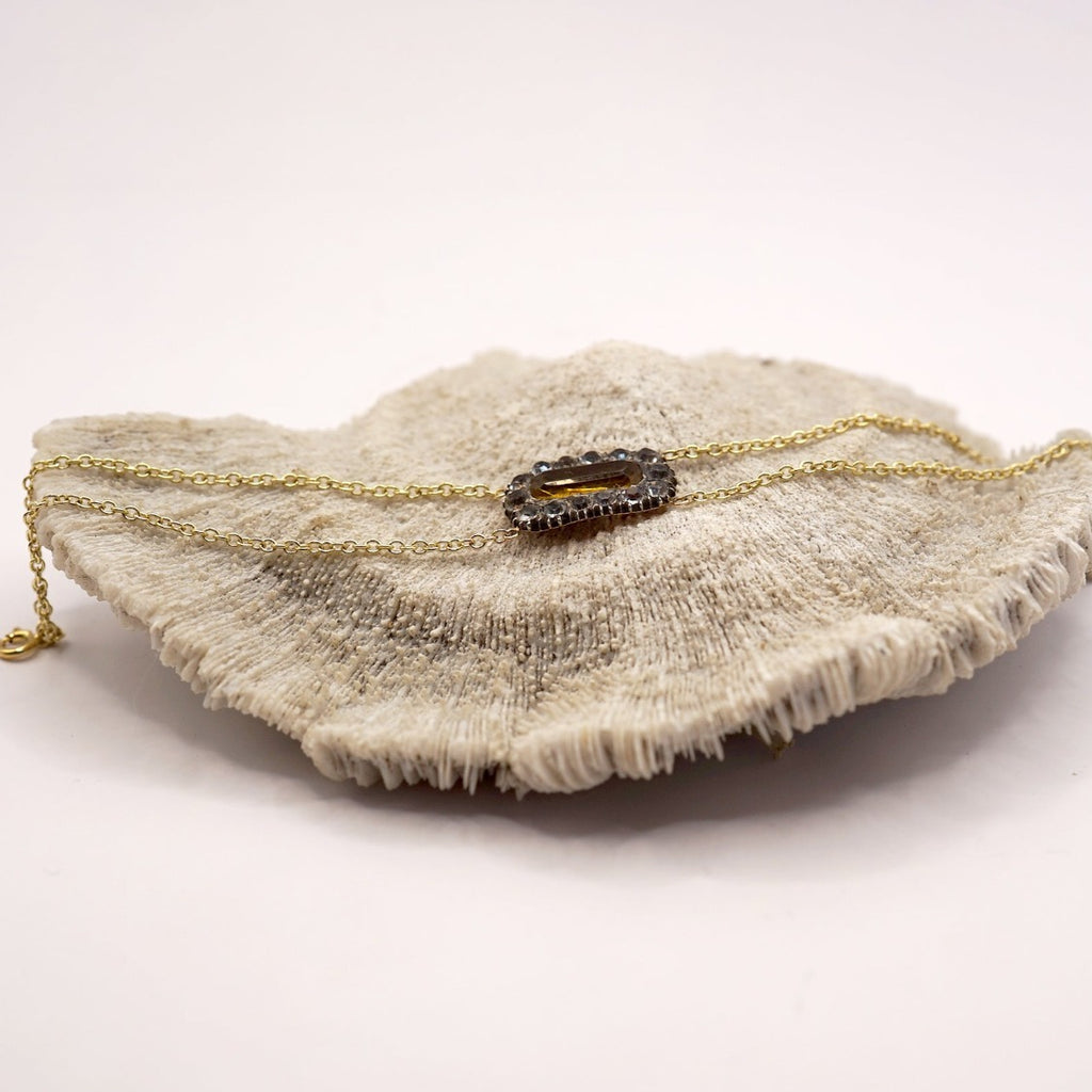 The central foil backed citrine stone is surrounded by paste (hand-cut glass) diamonds. Paste jewellery became popular in the Georgian period as a cheaper alternative to diamonds.