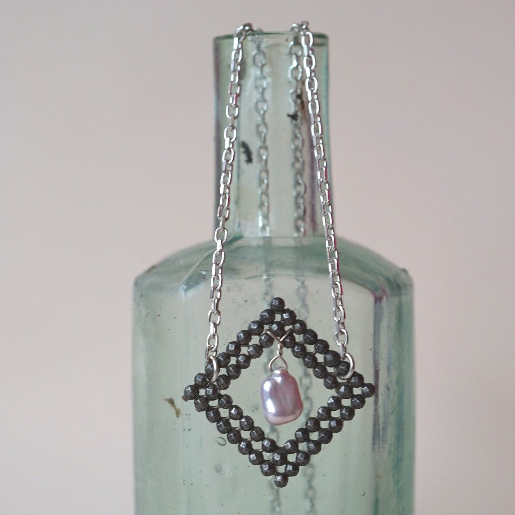 A Georgian gem of a cut steel buckle has been transformed into a 3rd eye necklace with the addition of a freshwater flat pearl hanging from an inner corner of this beautiful piece. It was likely a hair adornment originally and measures ¾" (2cm approx) square. This 'diamond' hangs from a lightly oxidised 17" (46cm) silver belcher chain.