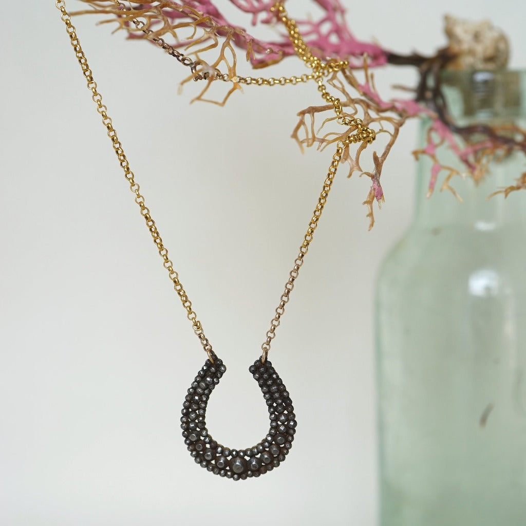 This fabulous Georgian cut steel horseshoe was originally a shoe buckle and has been transformed into a beautiful necklace with the addition of a gold belcher chain.