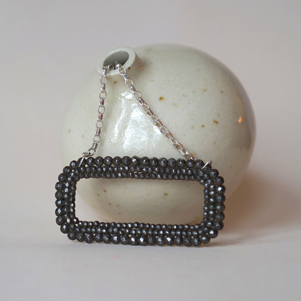 This rounded oblong buckle consists of 3 rows of different sized cut steel studs and measures 2" x 1" (5cm x 2.5cm) and hangs from an 18" (46cm) silver belcher chain. The refracted surface of the dark cut steel contrasts beautifully with this silver chain.