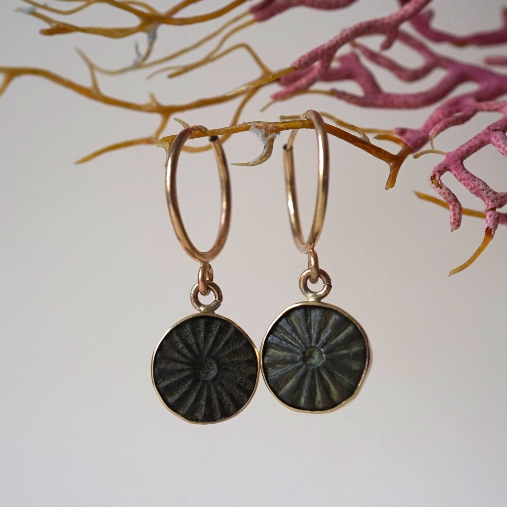 Two 18th century slightly mismatched bronze buttons have been encased in gold and hung from a gold creole hoop another gorgeous unique piece of Badger's Velvet jewellery.