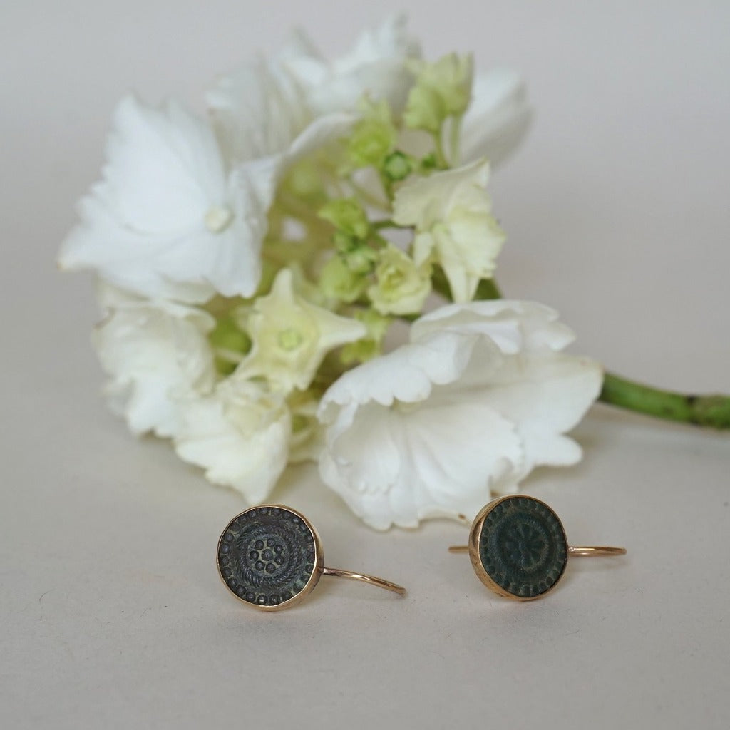 Two 18th century mis-matched bronze buttons have been encased in gold bezels and attached to Roman style hooks.