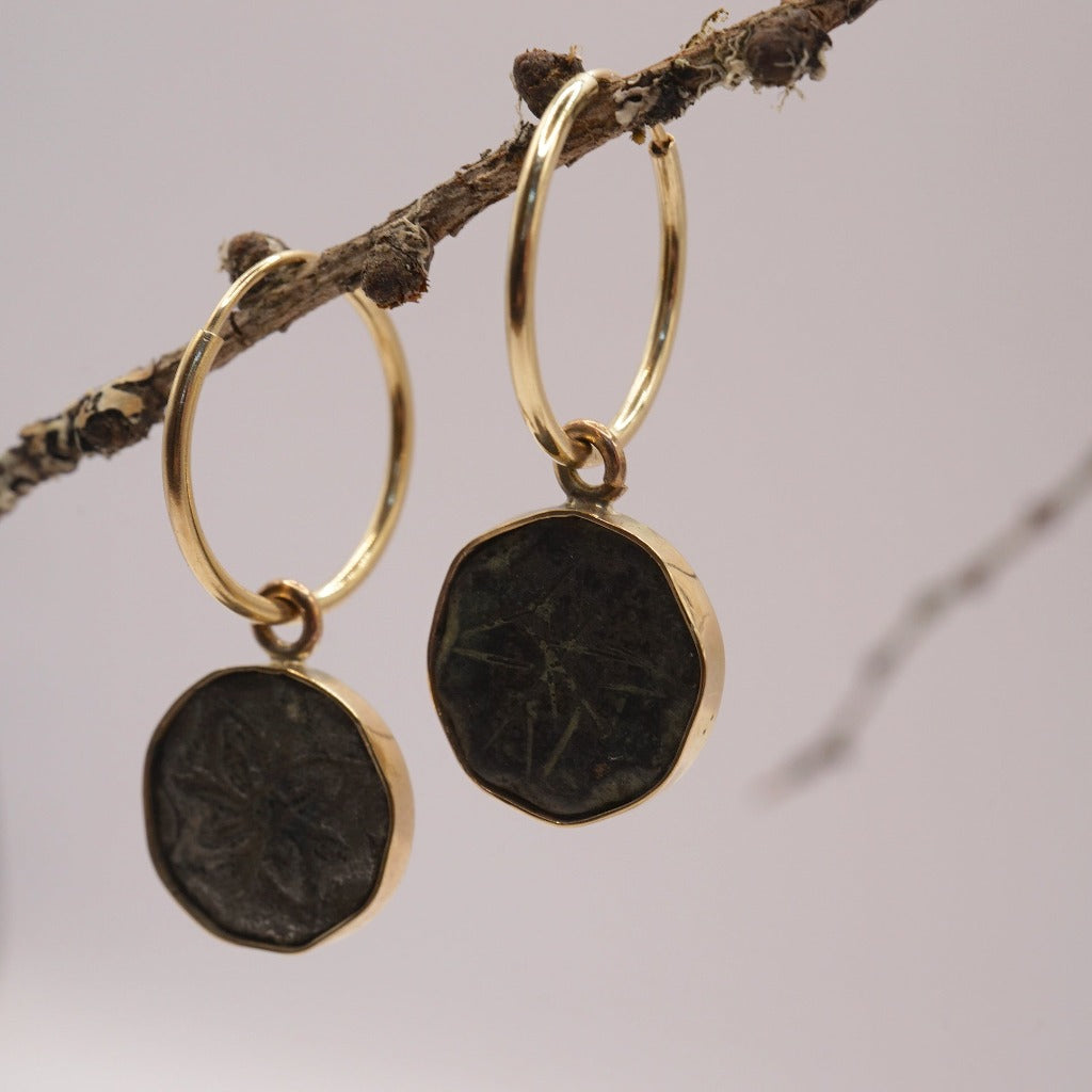 Two 18th century mis-matched bronze buttons have been encased in gold and hang from 16mm gold hoops to create another unique pair of Badger's Velvet earrings.
