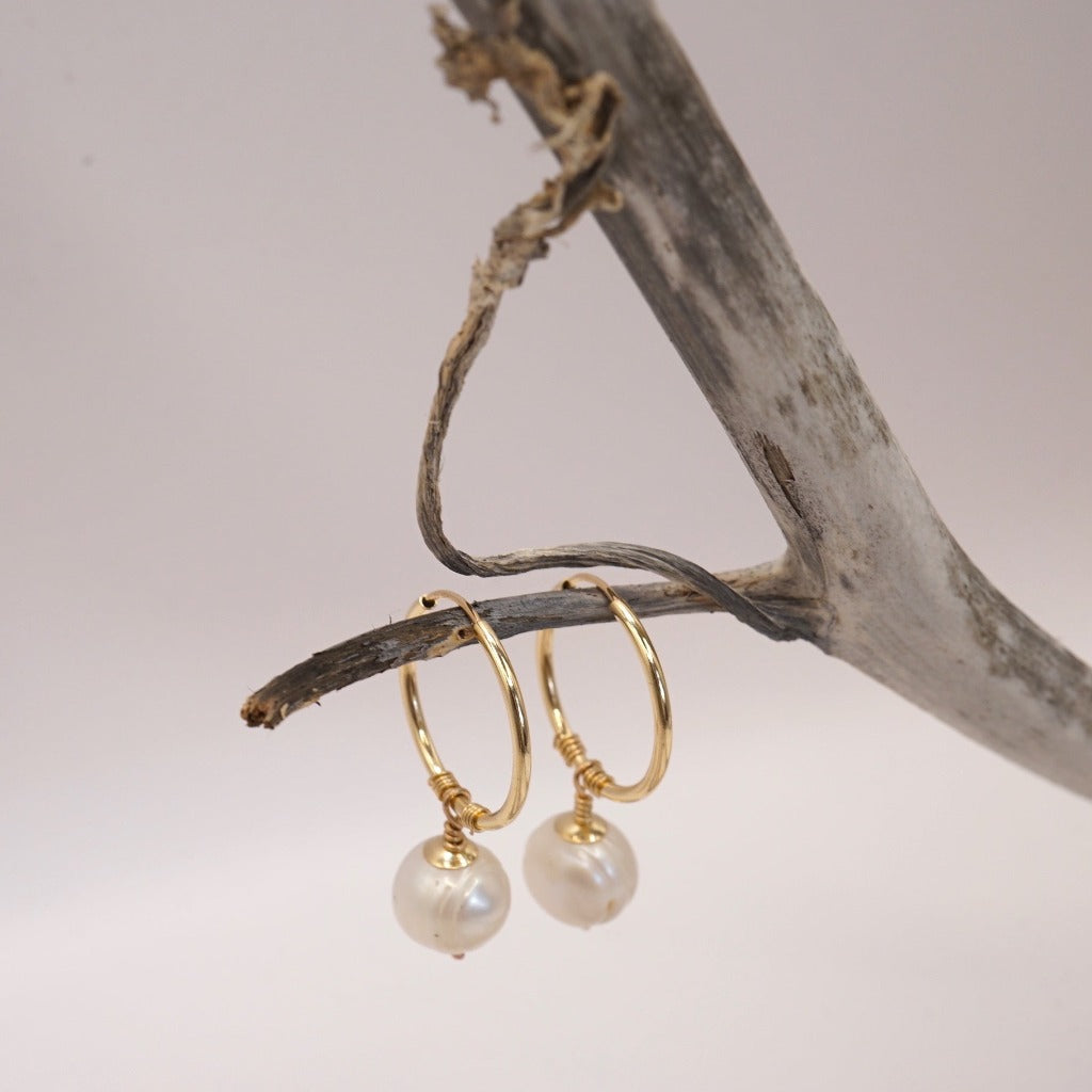 A beautiful pair of natural freshwater round pearls hang from 14ct gold-filled creole hoops