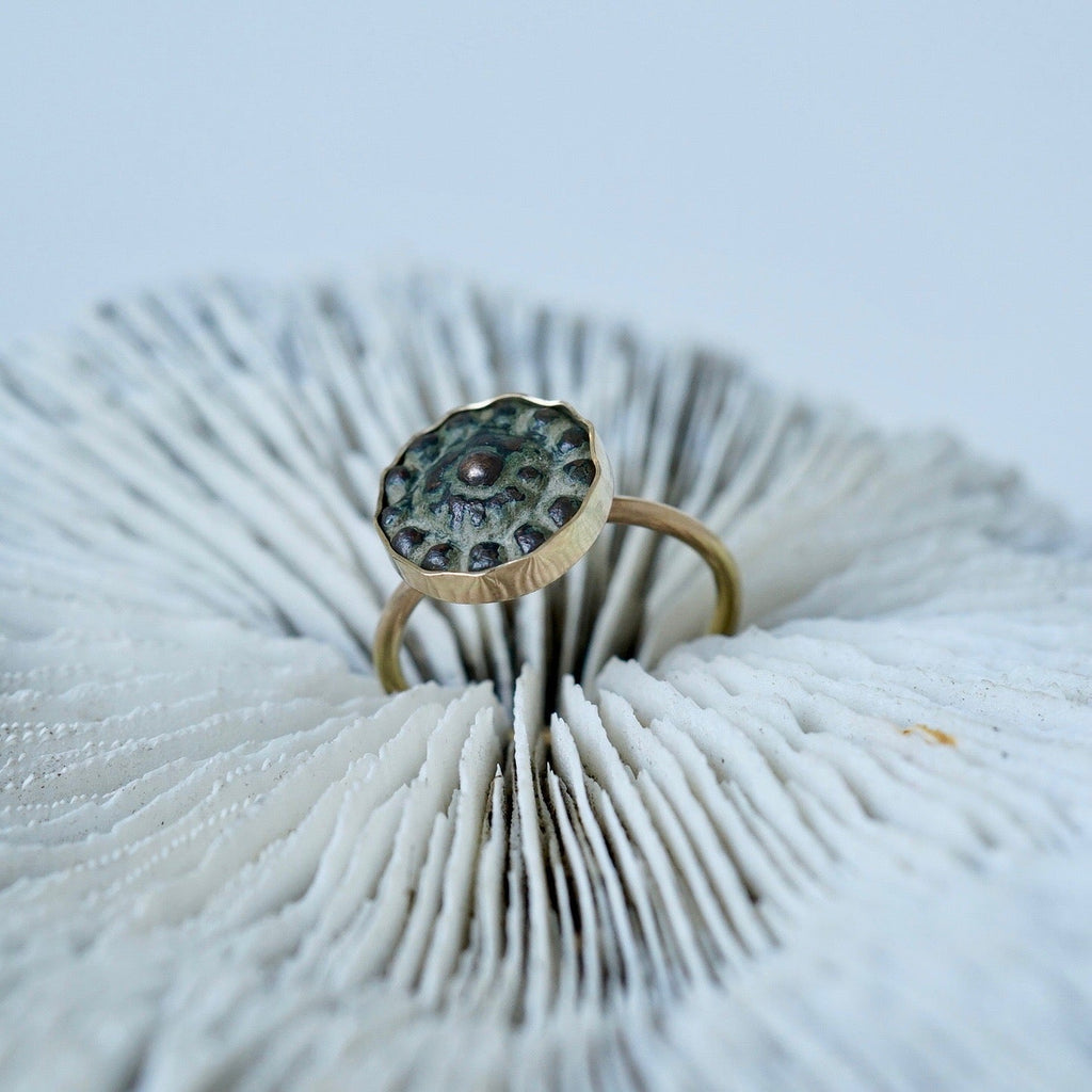 Set into a 9ct Gold bezel and mounted onto a gold band, the bronze will begin to show through as the dark patina of age wears with everyday use. This makes for an evolving stylishly classic piece of jewellery.