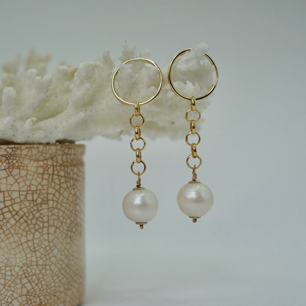 A beautiful pair of round pearls hang from 14ct gold-filled belcher chain and hoops.
