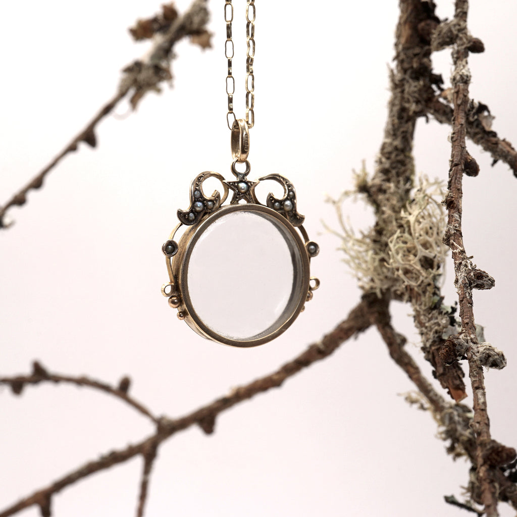 This unique necklace is made from a substantial Victorian gold and crystal glass locket which has a beautiful seed pearl star and crescent moon detail at the top, the glass is original