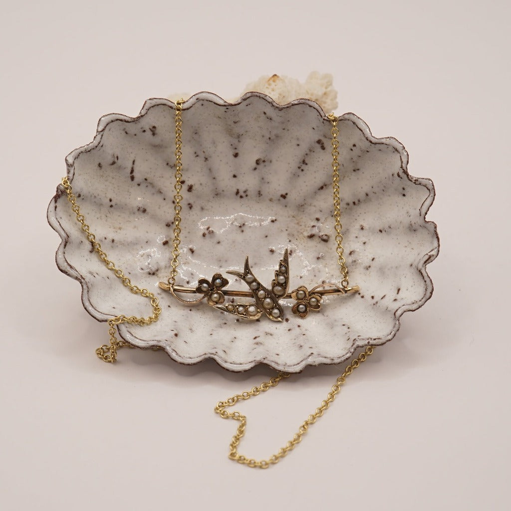 The yellow gold swallow sits on a fine gold bar with two three leaf clovers, one at either side, all inset with natural seed pearls.