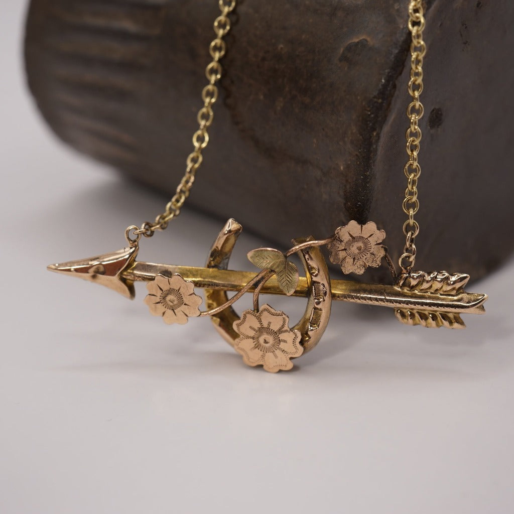 Antique 9ct gold Cupid's arrow with a horseshoe wrapped in three flowers, originally a brooch and likely a Victorian Love token we have transformed this rare find into a contemporary Necklace adding an 17" 9ct gold chain