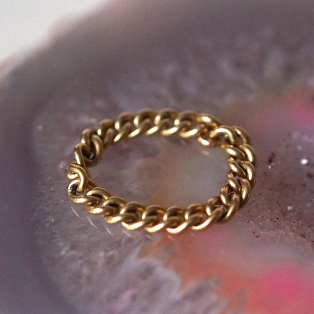 We have made this unique and stylish ring from a length of rolled gold chain left over from a re-purposed watch chain that became a necklace and is now sold .