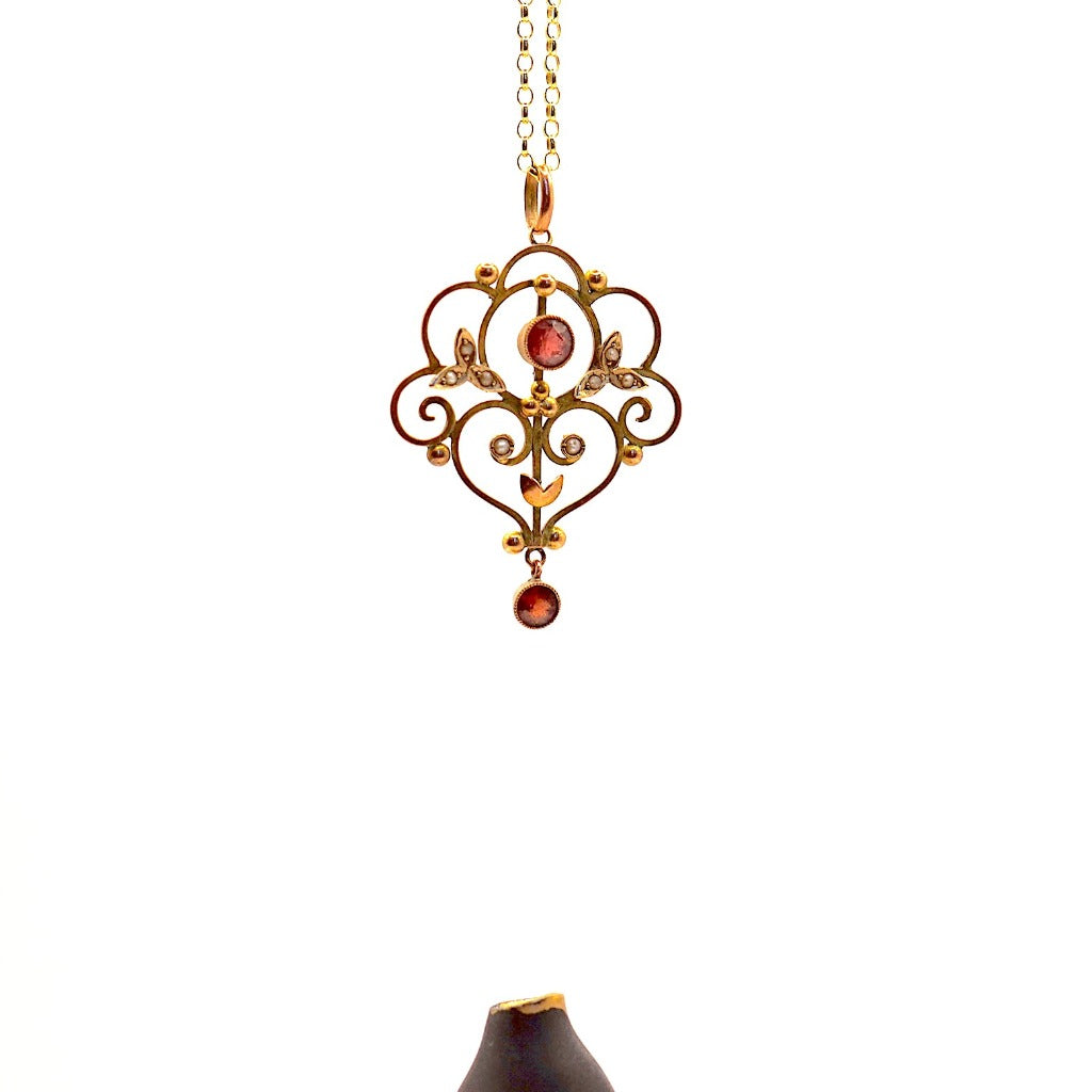 This stunning Edwardian pendant has seed pearls sitting against a filigree setting with 2 garnets, both encased in gold bezels, one at the centre and one at the base.