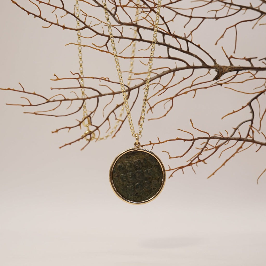 An original ancient coin, a metal detector find, bought by Badgers velvet from an antiquities dealer has been encased in a 9ct gold circular coin mount and attached to an 18" 9ct gold Belcher chain.