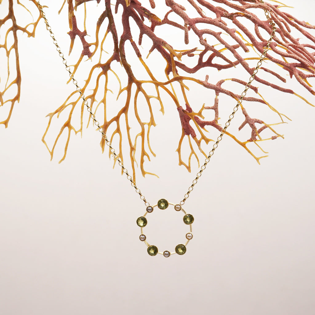 An early 20thC gold peridot and split pearl garland brooch stamped 15ct gold has been repurposed by removing the back bar and it now hangs from a 16" 9ct gold fine belcher chain