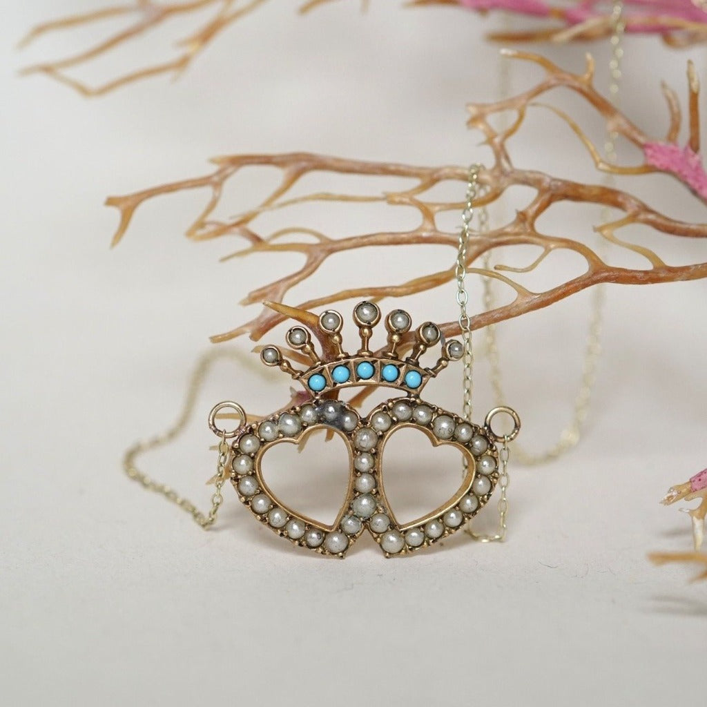 This symbolic piece of jewellery shows a crown aloft two hearts which represents love conquering all.