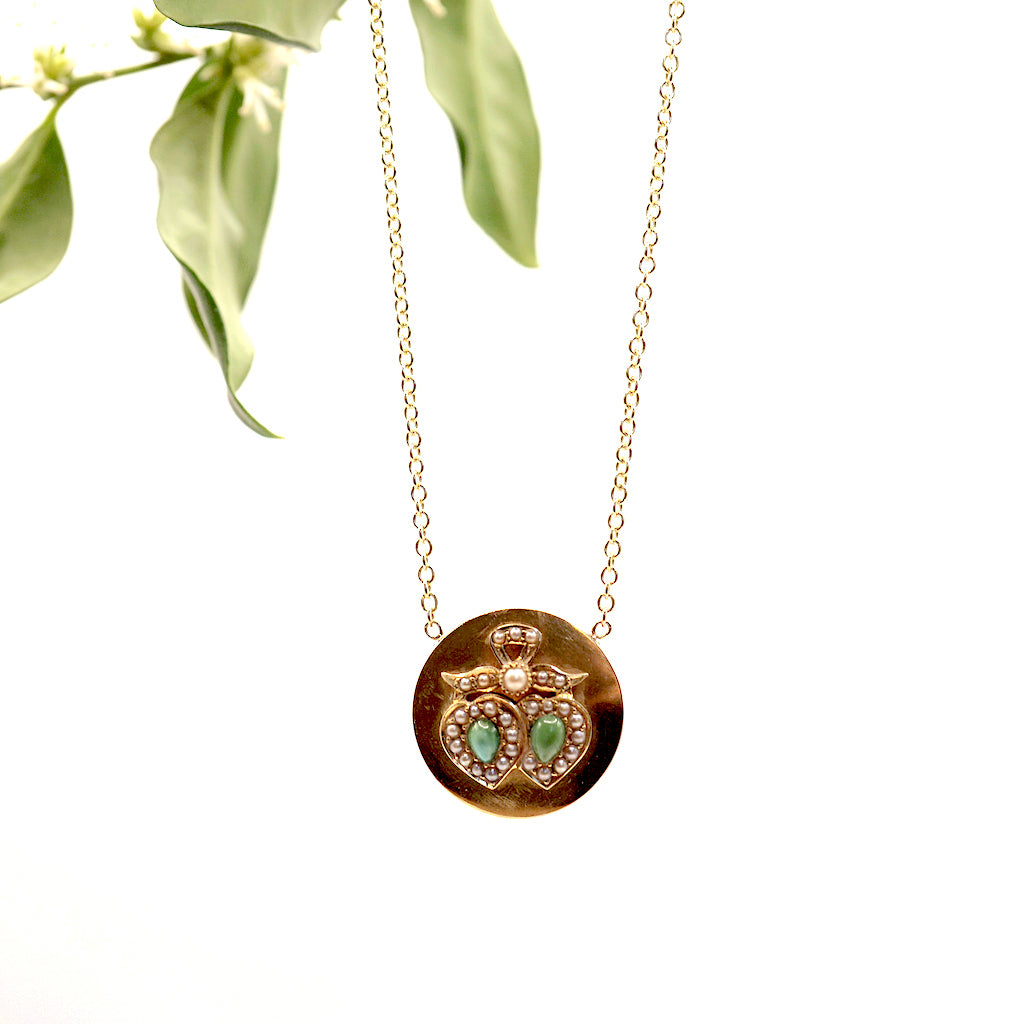 Its a circular form with a 1" (25mm) diameter, the twin heart motif, set with two turquoise bordered by seed pearls is topped by a ribbon scroll with a larger pearl at its centre.