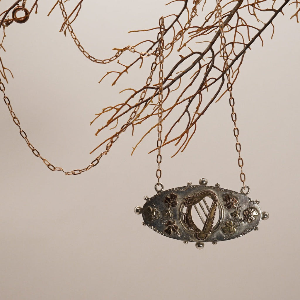 The silver oval is adorned with shamrocks and has a gold plated harp at its centre.