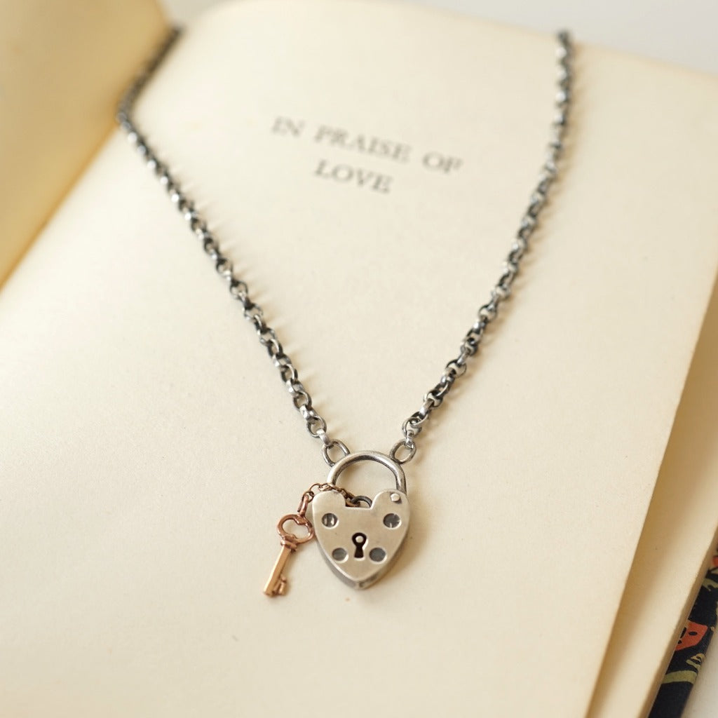 An original antique silver belcher chain has been attached to a vintage silver heart bracelet 'lock' (now soldered closed). There is a gold chain and key attached to the lock to create this 'Key to My Heart' pendant.