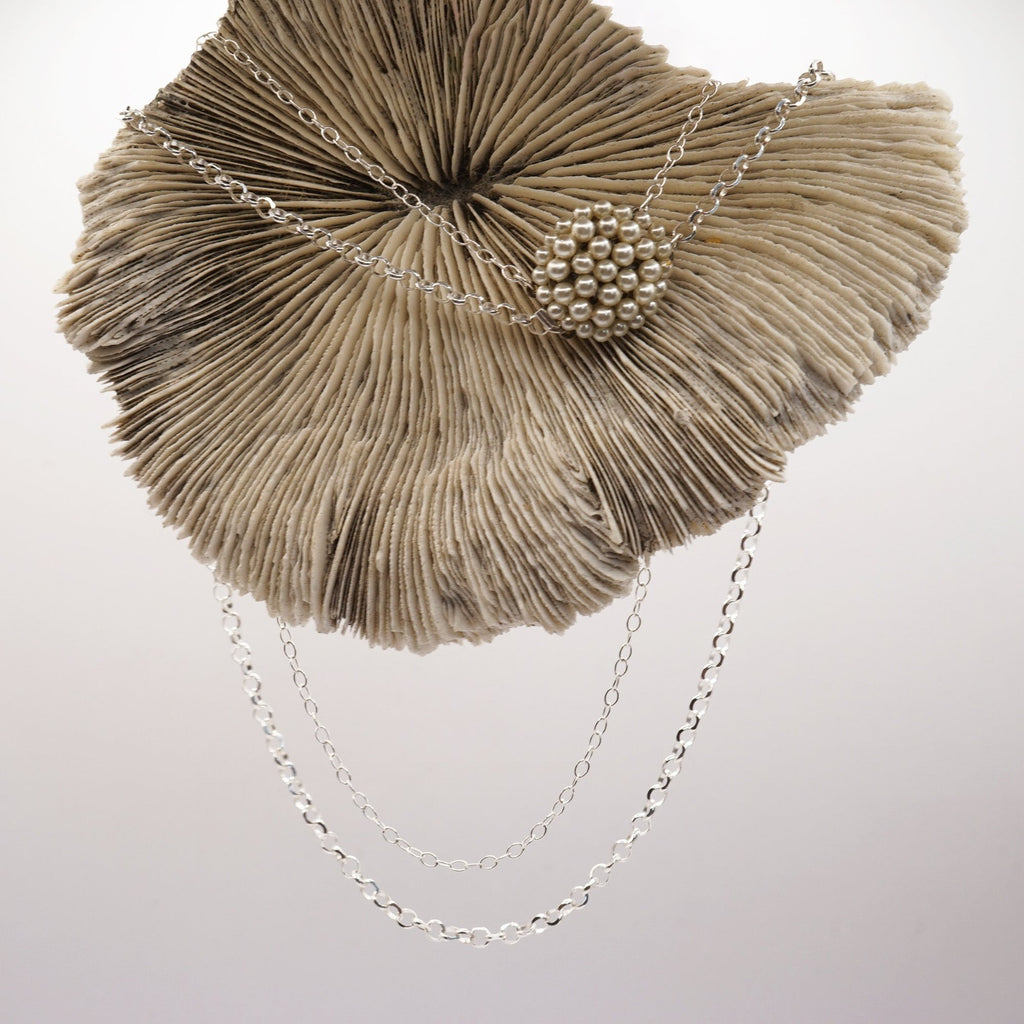 A beautiful antique silver and seed pearl clasp has been hung with 2 contrasting silver chains.