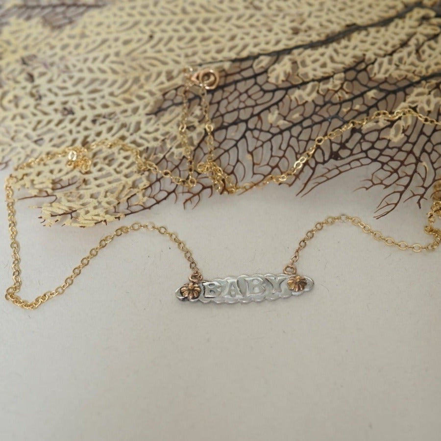 This original piece has the word baby de-bossed into the surface and at either end we have added a gold flower from which hangs a gold chain.