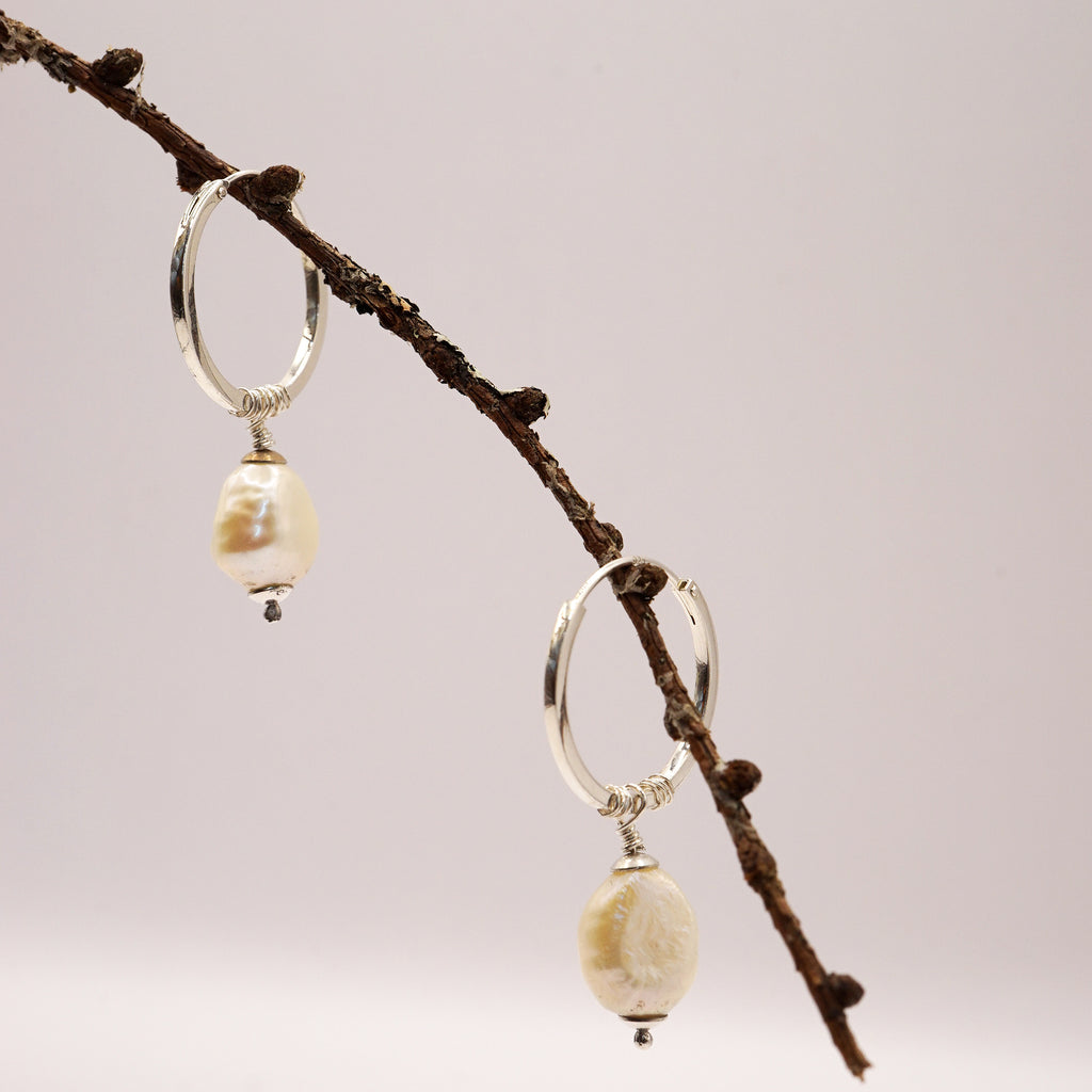 A beautiful pair of natural freshwater pearls hang from silver square edge hoops