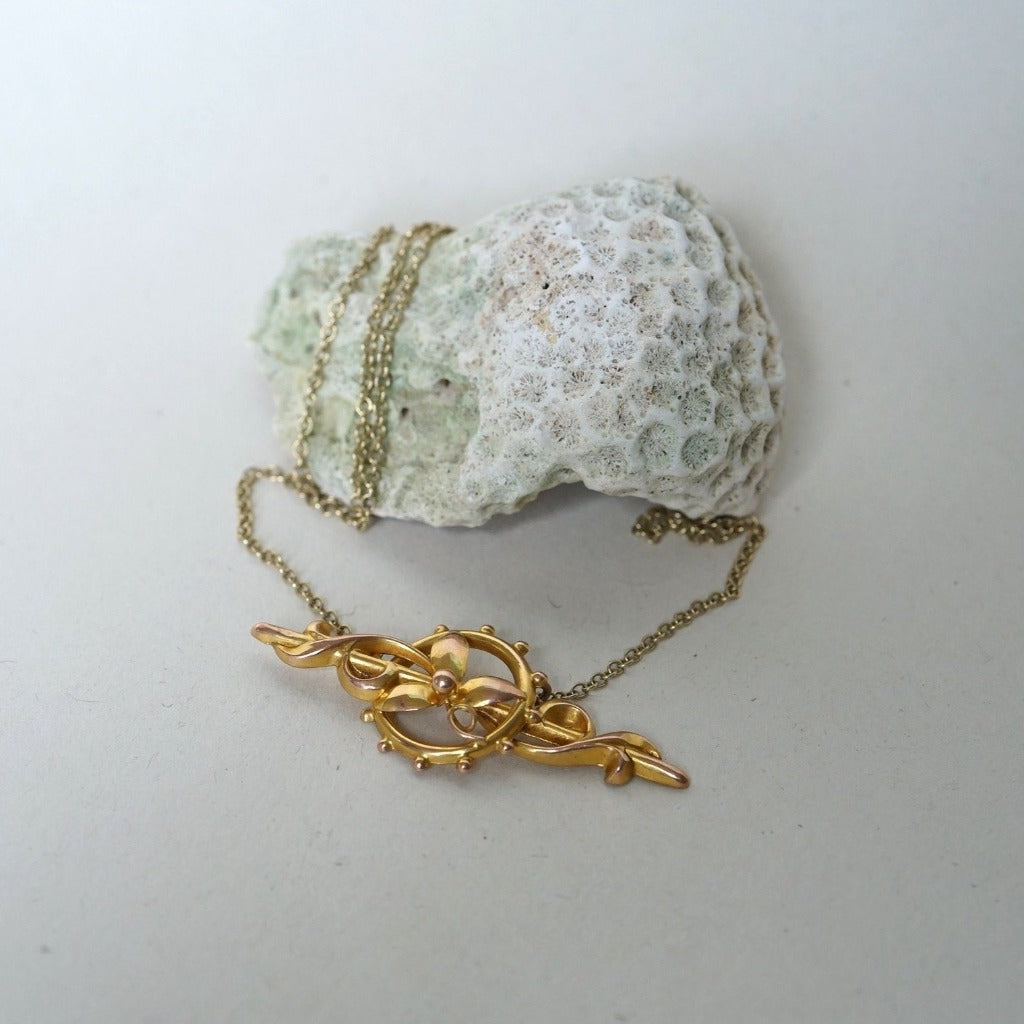 A Victorian 9ct gold flower and leaf love heart brooch has been transformed into a beautiful necklace and now hangs from a fine gold belcher chain.