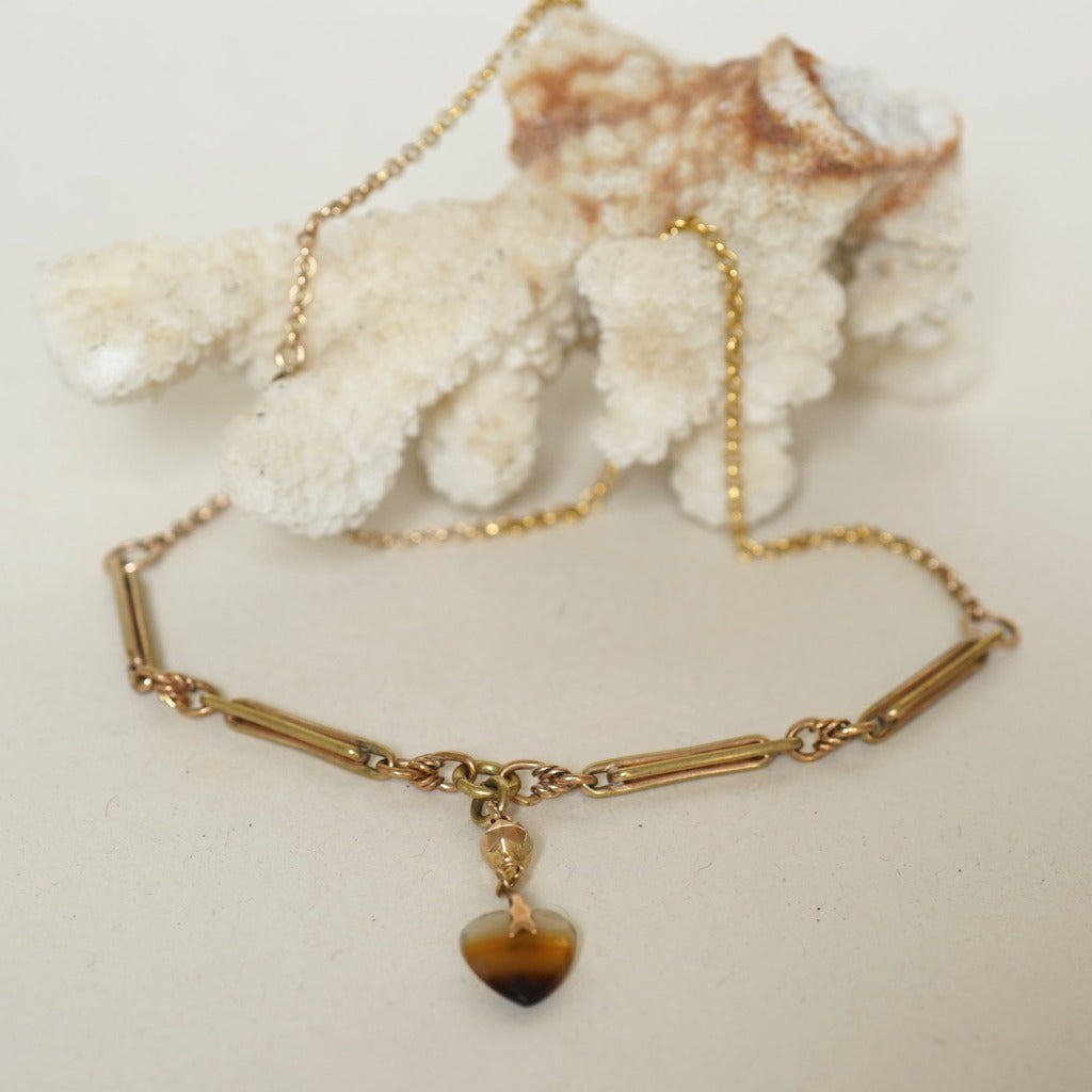 This necklace is made up of a length of Victorian trombone link watch chain with its original banded agate heart fob and with the addition of a fine belcher chain.