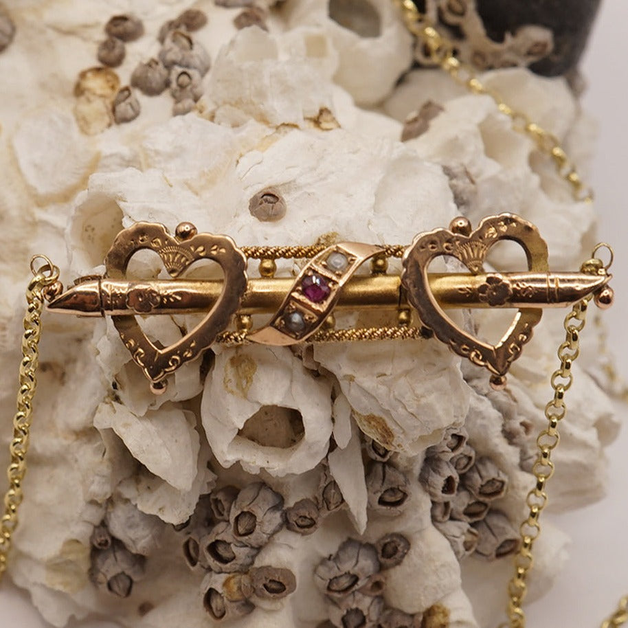 This fine Victorian 9ct gold Ruby and Pearl etched double heart piece began life as a brooch . At the centre sits a scroll with the ruby and seed pearls either side are two hearts entwined around the substantial gold bar.