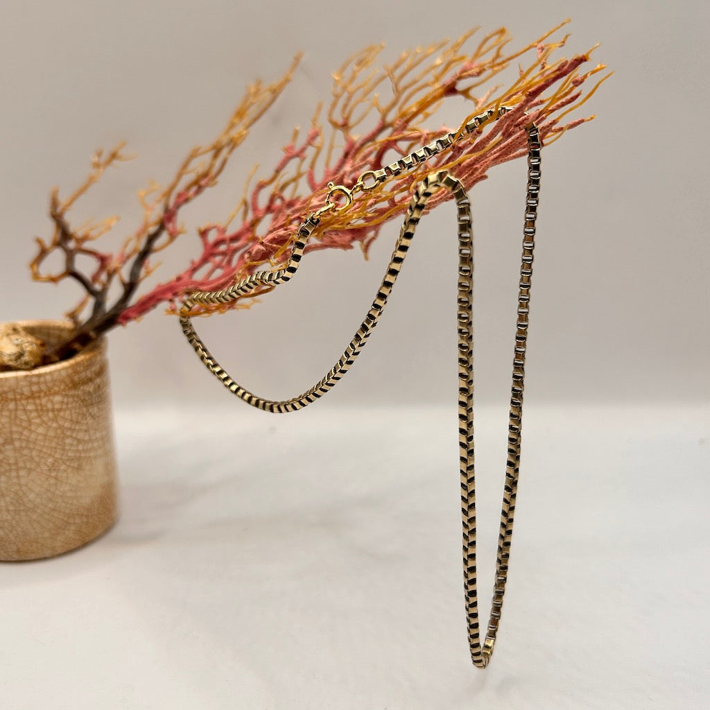 We have created this fabulous necklace from a section of Victorian gold box-link guard chain.