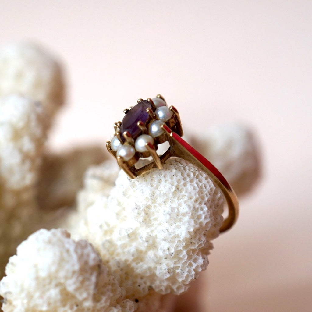 An original vintage 9ct gold ring set with an oval amethyst surrounded by seed pearls.