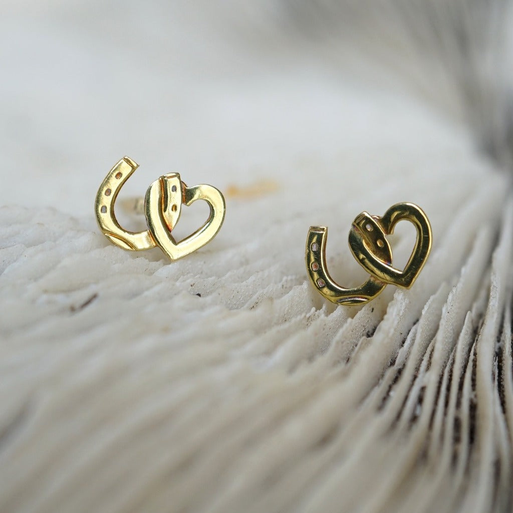 A heart and horseshoe are intertwined together and the gold pin back is hinged so that there is no need for a butterfly back.